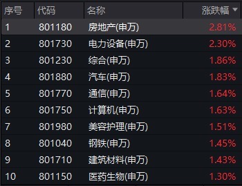 房地产板块领涨,整体涨幅2.81%。中洲控股涨停,南国置业涨超6%,万科A、信达地产、金地集团、荣盛发展、特发服务、渝开发、世联行等跟涨。